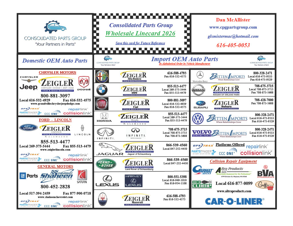 All contents of this website are NOT to be considered as legal or professional assistance, guidance, or facts and are available on an "as is" format. Any use of the websites information, tools, or any other element is not warranted by Consolidated Parts Group, any of it's partners, or contributors.